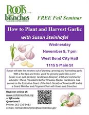 Presented by Susan Steinhafel. Susan will take the mystery out of planting, growing and harvesting garlic. With a few tips and tricks, you’ll be growing garlic like a pro! Susan is an avid gardener, landscape designer, artist and community educator. She is President-Elect of Ozaukee Master Gardeners, has served on the Executive Board of the Herb Society of America-WI and is a Board Member and Program Chair with Roots and Branches.